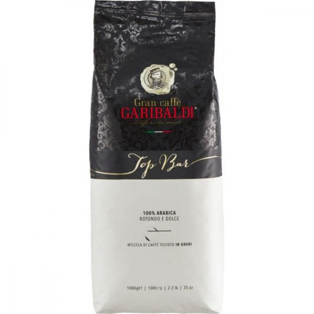 Зернова кава Garibaldi Top Bar – 100% Арабіка від світових країн-виробників (Бразилія, Ефіопія, Індія). Спеціальне французьке обсмажування, при якому досягається повне випаровування вологи, виступ цукру та ароматичних олій на поверхні кавових зерен, робить смак Top Bar м'яким, кислувато – солодким, делікатним, а аромат горіхово – карамельним.